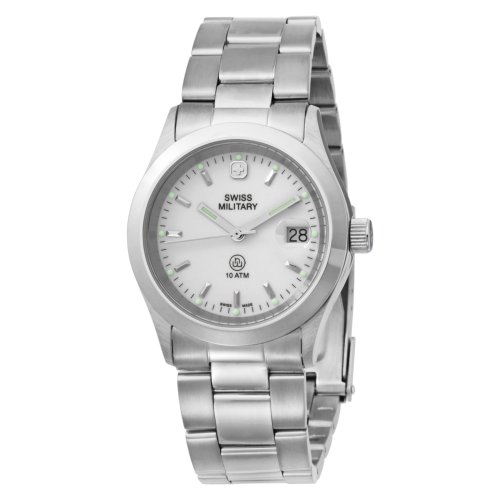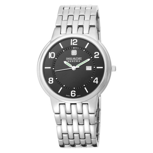 The sleek stainless steel and round design gives the Swiss Military Hanowa Men's Rendezvous 316L Stainless Steel Black Dial Watch a simple, yet sophisticated style. The large case features a round silver-toned bezel, giving a shining backdrop to the black dial. Slender hour, minute, and second hands tick in the middle of a thin circle displaying short white dashes at each minute and round studs at each hour. White blocky Arabic numerals mark the even hours towards the edge of the face, matching the long lines sitting at the odd hours. The Swiss Military cross appears just below the 12 o'clock, the same size as the calendar display by the three o'clock. The light green inside the hands and studs gives a subtle glow in the dark, so you'll always be able to tell the time no matter where you and your watch are. The wide band consists of small, tightly linked stainless steel pieces, offering a close fit and smooth feel. Closing with a deployment clasp, this handsome timepiece is water resistant up to 165 feet (50 meters) and boasts the reliability of Swiss quartz movement.
