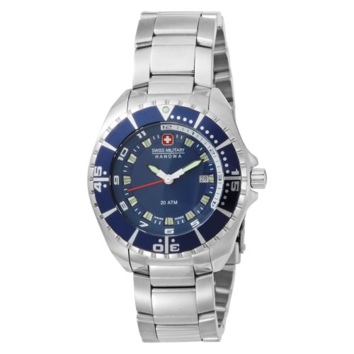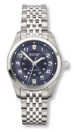 Stainless Steel Case, Blue Dial with Luminous Hands & Hour Markers, Stainless Steel Bracelet, Date Displayed at 6, Military Time, Swiss-made Self-winding Mechanical Movement, Scratch Resistant Sapphire Crystal