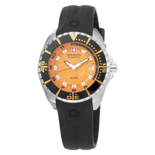 The Sealander Lady is the signature timepiece from Swiss Military. With distinct features like domed mineral glass, unidirectional revolving bezel, water resistant level down to 200 meters and a sporty black rubber strap, the women's Sealander is the watch of choice for female outdoor and water sport enthusiasts. The watch is equipped with a luminous dial markers and hands for easy night reading. Swiss-precision quartz movement. 2-year guarantee. Battery life of 48 months.