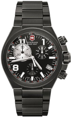 Black PVD titanium case and bracelet. Tachymeter. Black dial with luminous hands and hour markers. Date display at the 4 o'clock position. Chronograph - three sub-dials displaying: 30 minutes, 60 seconds and 1/10th second. Tachymeter. Screw-in caseback. Quartz movement. Scratch resistant mineral crystal. Case diameter: 42 mm. Deployment clasp. Water resistant up to 100 meters (330 feet). Victorinox Swiss Army Black Titanium Convoy Chrono Titanium Mens Watch 241255